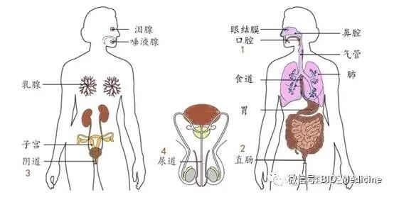 艾滋病的母婴传播和性接触传播主要由生殖器官分泌释放的液体充当HIV传播的载体。虽然这些分泌液中的病毒不能通过皮肤入侵人体,但可以通过各种粘膜入侵人体。已知HIV入侵的粘膜部位较多,包括:1)上消化道粘膜。如HIV阳性母亲乳汁可与婴儿口腔、咽喉、食道和胃粘膜接触。2)直肠粘膜。如HIV阳性个体的精液可与直肠粘膜接触。3)女性生殖道粘膜。如HIV阳性个体的精液可与阴道、子宫及输卵管粘膜接触。4)男性生殖道粘膜。如HIV阳性个体的阴道分泌液可与男性尿道粘膜接触。