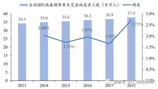 根据 UNAIDS,截至 2018 年末,全球范围内 HIV 病毒携带者及艾滋病患者人数约 3,790 万人。