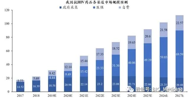 目前抗 HIV 用药市场规模在 15-20 亿元左右。随着患者基数增加、诊断率和治疗率提高、医保支付能力提升及自费人群的逐渐增加,将共同推动我国抗 HIV 用药市场规模的快速提升,根据 IMSHealth&Quintiles 研究报告,预计到 2027 年,我国抗 HIV 药物市场规模将超过 110 亿元。按照病人数量测算,政府免费治疗渠道约占 60%,医保支付渠道约占 36%,高端自费市场渠道约占 4%;按照金额规模测算,预计到 2027 年,医保支付渠道将占 60%,政府免费治疗渠道和高端自费市场渠道各自约占 20%。