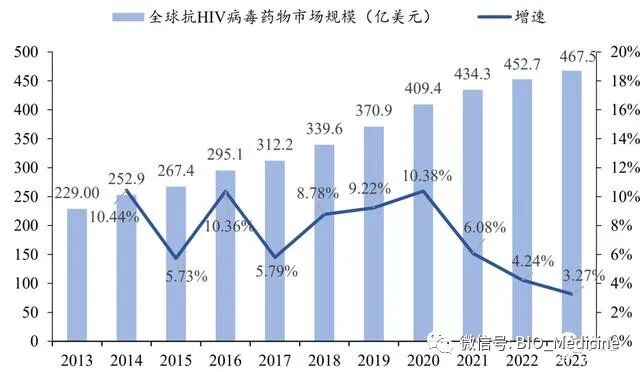 全球抗 HIV 病毒药物市场的规模由 2013 年的 229 亿美元增加至 2018年的 339.6 亿美元,年均复合增长率 8.2%。预计到 2023 年,全球抗 HIV 病毒市场将达到 467.5 亿美元,2019 年至 2023 年期间的年均复合增长率 6.0%。