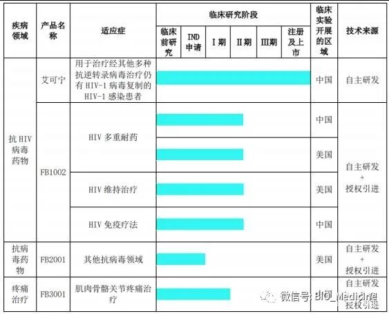 公司拥有先进的长效多肽技术平台及新型透皮贴片制剂技术平台。依托长效多肽技术平台,公司在抗HIV领域自主研发了系列创新药产品,包括已上市的国家1.1类新药艾可宁及在中、美两地申报临床、针对多个HIV适应症的在研项目FB1002(艾可宁+3BNC117联合疗法);并通过公司的多肽研发平台布局了多个长效多肽类储备项目。依托新型透皮贴片制剂技术平台,公司正在开发新型透皮镇痛贴片FB3001,拟用于治疗肌肉、骨骼及关节疼痛。同时,公司凭借积累多年的抗病毒药物研发经验,持续深耕其他抗病毒领域的新药研发。2020年新增抗病毒新药FB2001研发项目。