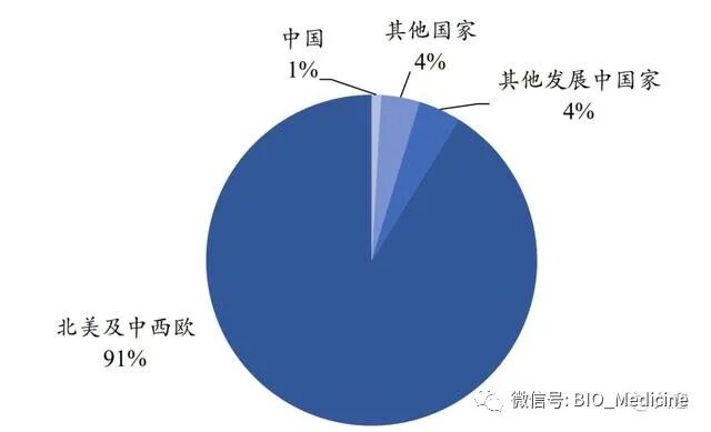 全球 HIV 病毒药物市场规模按区域划分主要为北美及中西欧。从区域结构来看,北美及中西欧市场为抗 HIV 病毒药物市场的主流市场。2018 年,北美及中西欧抗HIV 病毒药物市场规模达到 309.7 亿美元,占据全球整体市场规模的 91.2%。发展中国家市场占据整体药物市场的 4.12%,市场规模约为 14.0 亿美元。预计 2019 年至 2023年,发展中国家市场的药物市场规模将以 3.1%的年均复合增长率增长,到 2023 年该市场规模将达到 15.7 亿美元。中国抗 HIV 病毒药物市场规模较小,2018 年仅占比0.91%,预计到 2023 年该比重将提升至 1.6%。