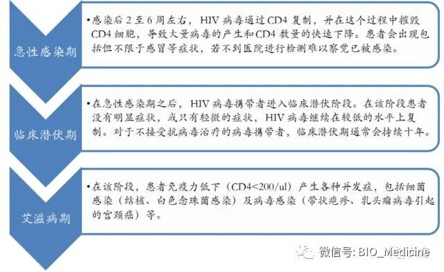 HIV 病毒会感染免疫细胞,如 CD4+T 细胞、巨噬细胞及树突状细胞。从机体宏观角度看,患者感染 HIV 后会经历感染早期和无症状期,该过程持续几年甚至几十年,此时患者称为 HIV 携带者。当患者体内 CD4<200/ul 时,进入艾滋病期成为艾滋病患者。