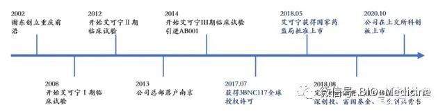 前沿生物成立于 2013 年 ;2014年开始艾可宁 III 期临床试验,同年引进AB001;2017年获得 3BNC117 全球授权许可;2018年艾可宁获得国家药监局批准上市;2020年科创板上市。